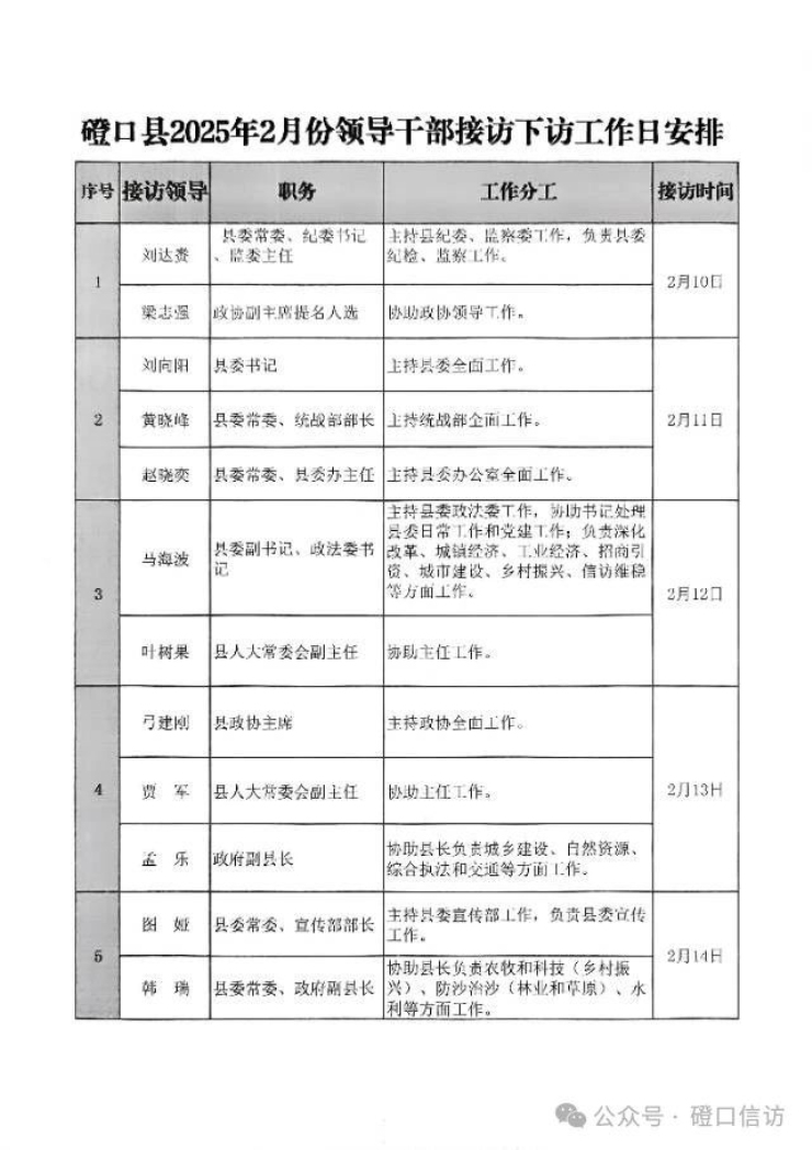 磴口縣2025年2月份領導干部接訪下訪工作日安排(2月10日--2月14日)