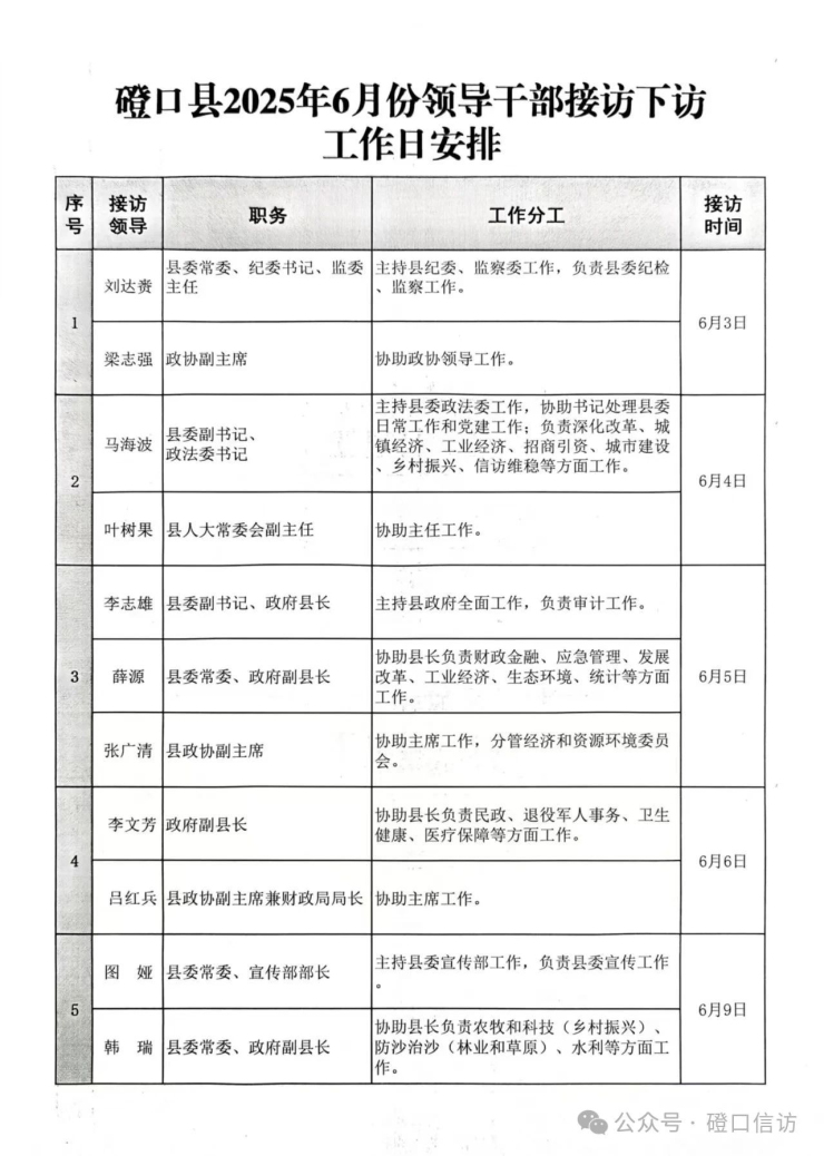 磴口縣2025年6月領導干部接訪下訪工作日安排
