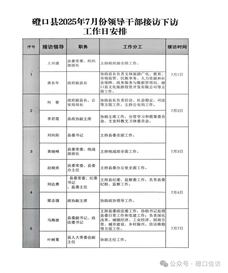 磴口縣2025年7月領導干部接訪下訪工作日安排