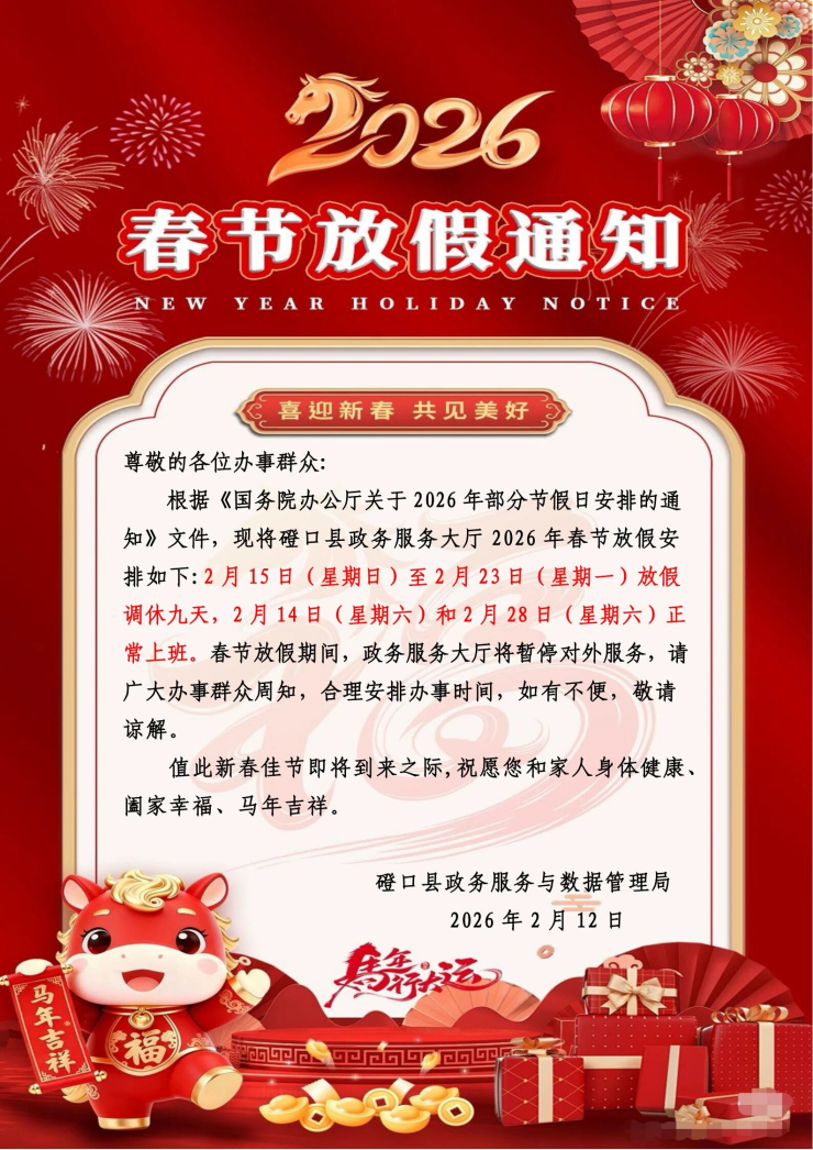 磴口縣政務服務大廳關于2026年春節放假通知