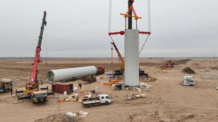 近日,在遠景能源景泰新能源磴口縣沙金套海蘇木48兆瓦分散式風電項目的施工現場,已經裝好的兩臺風機矗立在茫茫沙漠區域,運送大件的板車陸續進場,第三臺風機的塔桶正在緊張吊裝,整個工程項目加速建設,向著年底竣工的目標沖刺。