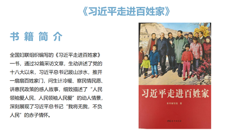 磴口縣圖書館副館長崔洋向大家推薦分享《習近平走進百姓家》一書,共同學習“小院的花香,從山里飄向山外”等篇章。