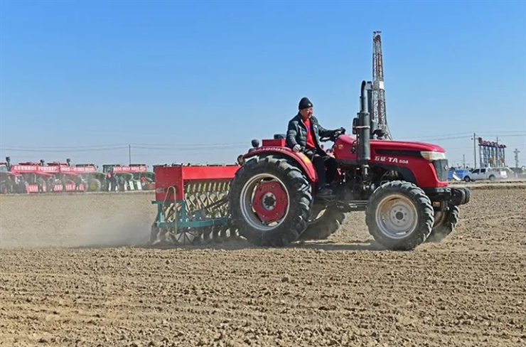 話音剛落,轟鳴聲起。農(nóng)機手開動播種機,兩排機械臂不斷將麥種和肥料均勻播入泥土中。一次次起落叩響大地,喚醒了河套的生機與活力。