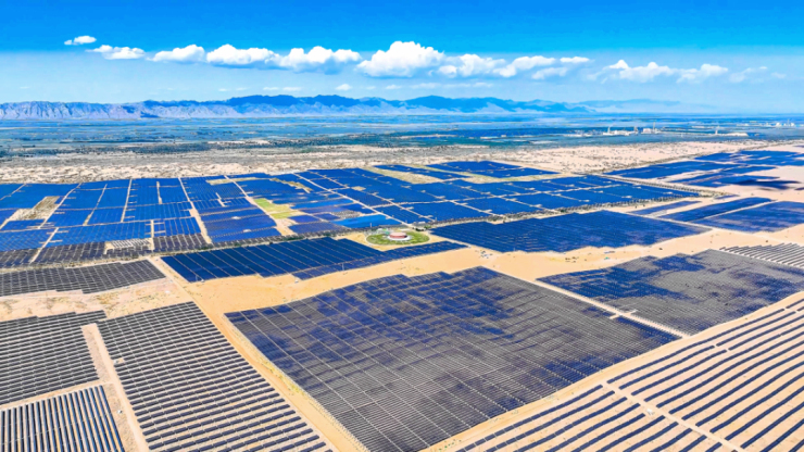 在蒙能85萬千瓦光伏+生態(tài)治理項目區(qū),一列列光伏矩陣向沙漠深處延伸,片片深藍色光伏板熠熠生輝。該項目于去年底并網(wǎng)發(fā)電,完成生態(tài)治理面積2.6萬畝。