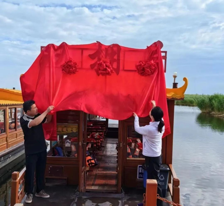 市退役軍人事務(wù)局相關(guān)負(fù)責(zé)人和納林湖董事長共同為磴口“雙擁號”揭幕,并宣布磴口“雙擁號”正式啟航。游船緩緩駛離碼頭,開啟首航之旅。磴口“雙擁號”游船馳騁于納林湖,不僅讓人們盡覽納林湖美麗風(fēng)光,更感受到了納林湖獨(dú)特的雙擁氛圍。