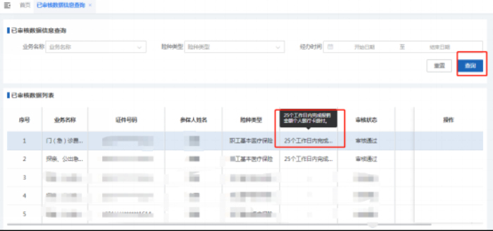 5.點擊【已審核查詢】查看審核結果,如審核通過, 25個工作日完成醫保基金撥付到個人銀行卡,期間請您耐心能待;如審核不通過查看“審核意見”按照要求重新申報。