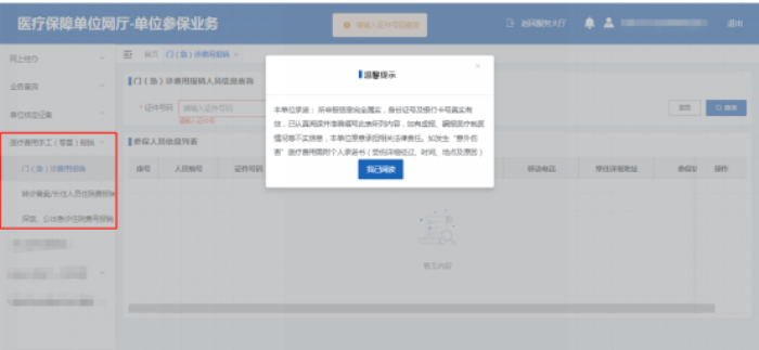 5.以【門急(診)費用報銷】為例,點擊功能按鈕進入申報頁面,仔細閱讀【個人承兌書】,確認申報材料真實有效