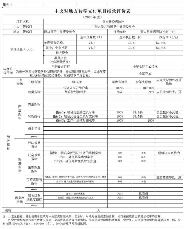1.數量指標完成情況:傳染病綜合報告率達100%,免疫規劃接種率93.53%.