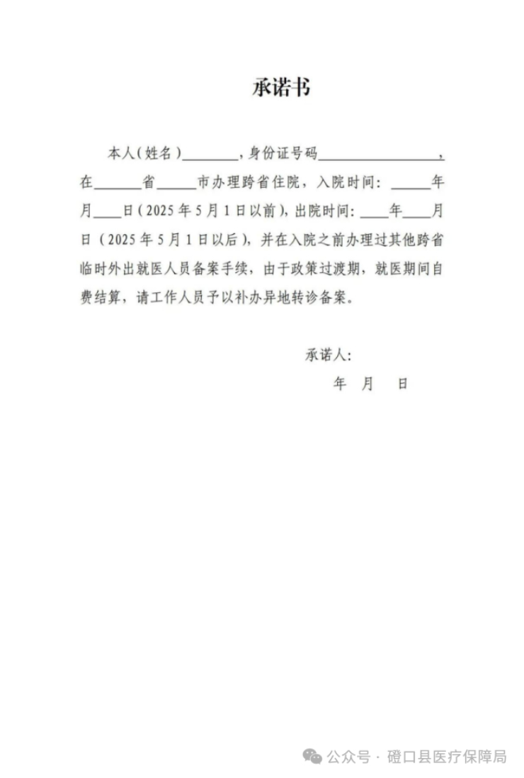 同時(shí)為保障我縣參保人員的權(quán)益,針對(duì)5月1日之前在省外辦理住院,并在5月1日以后辦理出院的其他跨省臨時(shí)外出就醫(yī)人員,可先行自費(fèi)結(jié)算,在參保地醫(yī)保經(jīng)辦窗口補(bǔ)辦異地轉(zhuǎn)診手續(xù)(出具書面承諾書)詳見附件2,在參保地醫(yī)保經(jīng)辦窗口進(jìn)行報(bào)銷;如果在省外已經(jīng)辦理異地直接結(jié)算,則不再進(jìn)行報(bào)銷。
