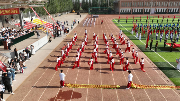活動中,磴口一中體育特長班40名學生組成的表演隊伍動作整齊劃一,是團結協作精神的最好詮釋,是青春活力的最好展現。實驗小學表演隊,國學武術操氣勢磅礴、渾厚有力,傳遞著中華民族的精神內涵,詮釋盛世華章的壯麗與輝煌。二完小腰鼓隊的同學們邁著整齊的步伐,踩著激昂的鼓點,揮舞著手中的鼓槌,盡顯粗獷豪情。三完小的花樣跳繩表演《繩采飛揚》,繩影蹁躚,繩采飛揚。實驗中學表演隊伍用自己的汗水和努力,詮釋著青春的活力和奮斗的意義。